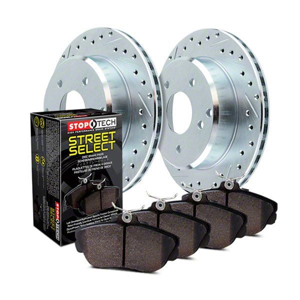 Designed to improve a vehicle’s looks and braking performance without breaking the bank; StopTech Select Sport Axle Packs include drilled & slotted silver zinc-coated rotors and StopTech Street Pads.