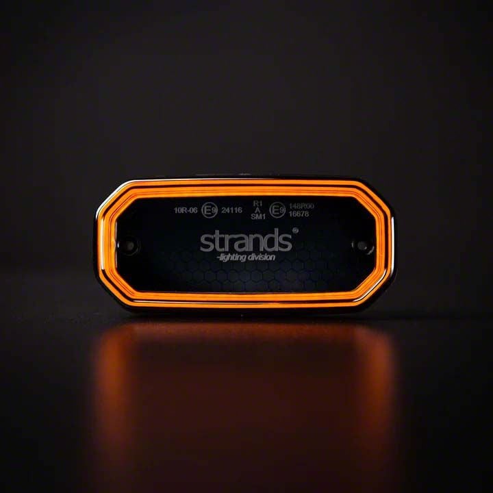 Stylish and Durable Side Marker Light. The Strands Lighting FOR9T Scale Side Marker Light offers a sleek and functional lighting solution for your vehicle. Featuring a bright amber light housed in a glossy black polycarbonate housing with a dark smoked hexagonal patterned lens, this marker light adds a stylish and modern touch to any vehicle. It is IP67-rated for water and dustproof durability, making it ideal for a variety of driving conditions.