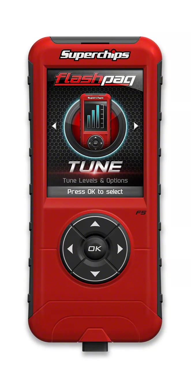 Compact, Convenient and Efficient. Featuring a full color, 2.8-inch high definition screen, this Superchips Flashpaq F5 Tuner has a slim, sleek design that makes it easy to handle and store in your center console or glove box when not in use. Not only is it compact, but its exceptionally graphic interface provides an improved user experience, when compared to the older Flashpaq F4 model. Powered by your vehicle's OBD-II port or USB connection when connected to your PC/Windows computer, this F5 Tuner features increased memory with a high speed processer to provide extraordinary tuning and updating speed.
