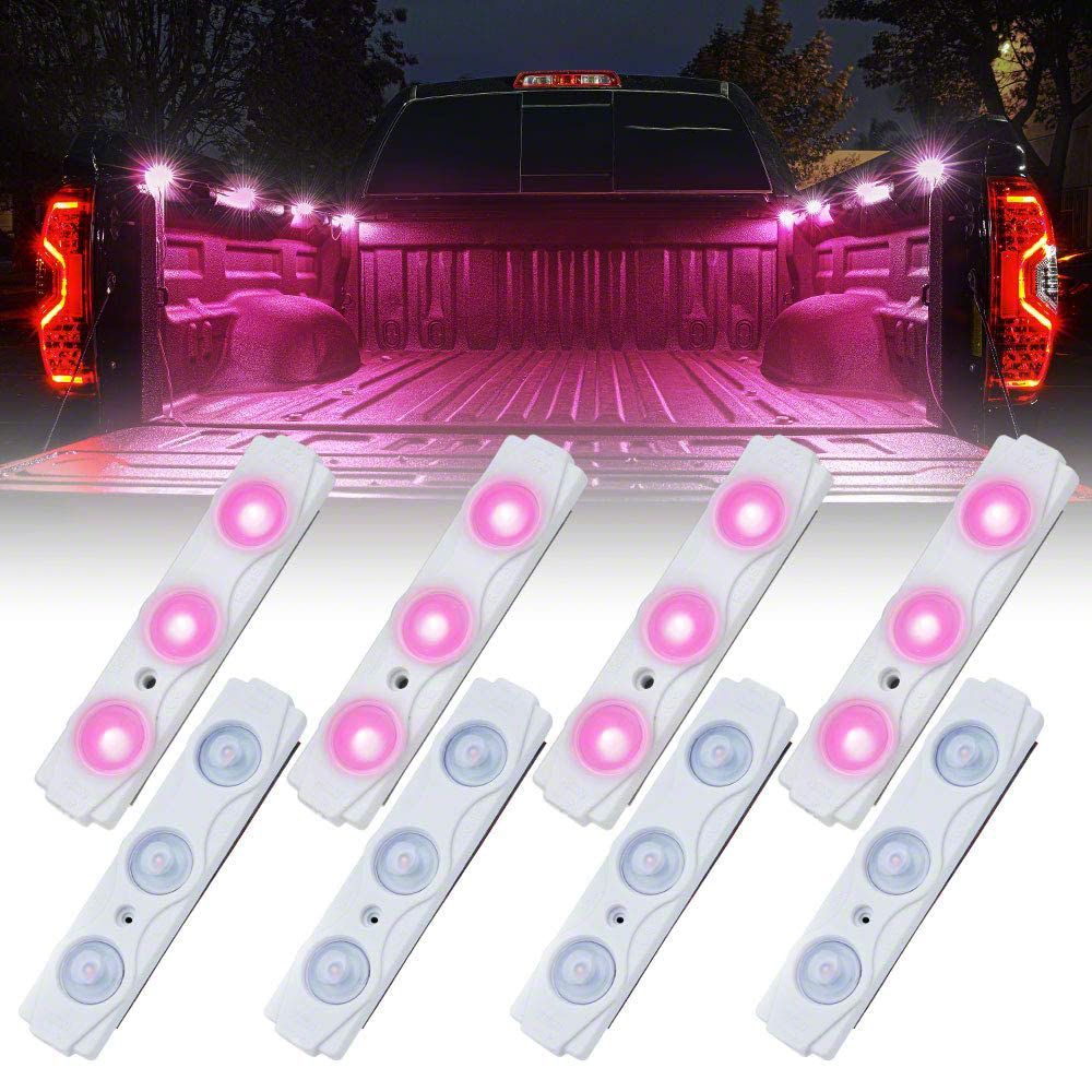 Application. This 8-LED Rock Light Pod Truck Bed Lightning Kit; Pink features a universal design so it will fit all make and models of trucks.