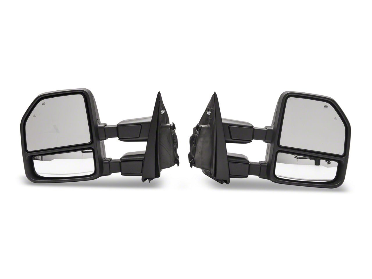 Side Mirror Replacement with Added Functionality. If you regularly take your Ford F-250 Super Duty out towing, you need these Black Powered Heated Towing Mirrors with Smoked Turn Signals. These towing mirrors are designed to telescope outwards offering extended side visibility. These assemblies also feature a large wide-angle and small convex mirror. These factors combine to virtually eliminate blind spots giving you added security when driving with a trailer in tow.