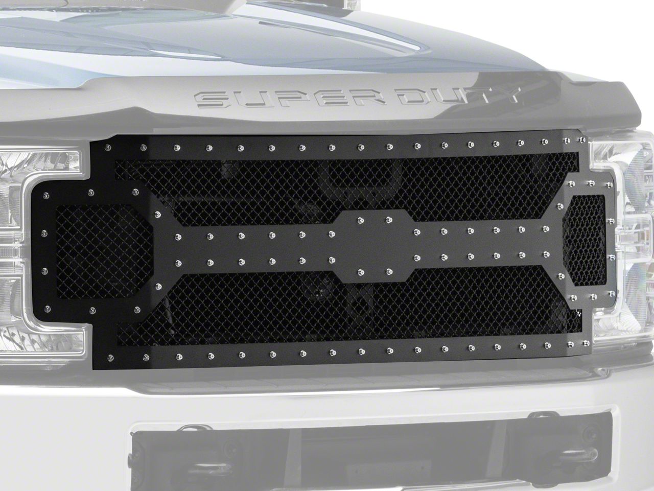 Menacing Front End Style. Give your F-250 Super Duty a more menacing front end look with this Carbon Steel Rivet Black Upper Replacement Grille. This upper replacement grille features a solid “frame” designed to follow the outline of your factory grille. This frame is then scored with eye-catching polished rivets and wire mesh panels on its center and sides. These design elements combine to give your truck’s front end a more menacing look. Best of all, this wire mesh won’t compromise airflow into your engine bay so your truck continues to perform as it should.