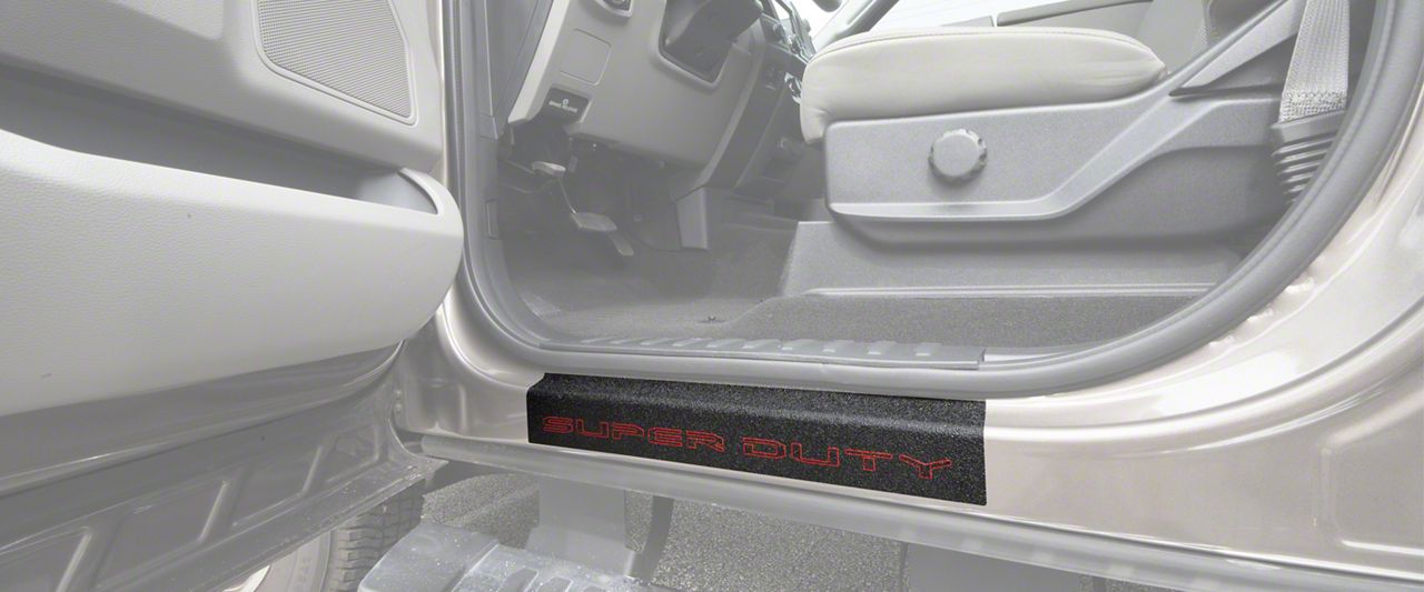 Door Sill Protectors. Add a more expensive, upscale appearance to your Super Duty's interior with a set of Front Door Sill Protectors that promote the Super Duty logo. These Tuf-Liner Series Door Sill Protectors feature a similar look to spray in bed-liner and will protect your F-250's sills from scratches, dirt, rocks, and chipping paint. These Door Sill Protectors are an affordable and simple way to personalize your Ford Super Duty.