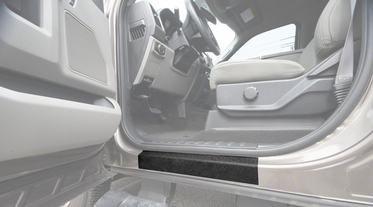 Protective Styling. Climbing in and out of your car multiple times daily will wear down your door sill. Additionally, you can make a mess quickly without adequate protection. The Tufskinz Front Door Sill Protection overlays set could solve both problems. The tough accessories prevent scratching and chipping, while the textured finish can trap dirt, mud, and other road debris from the bottom of your shoes.
