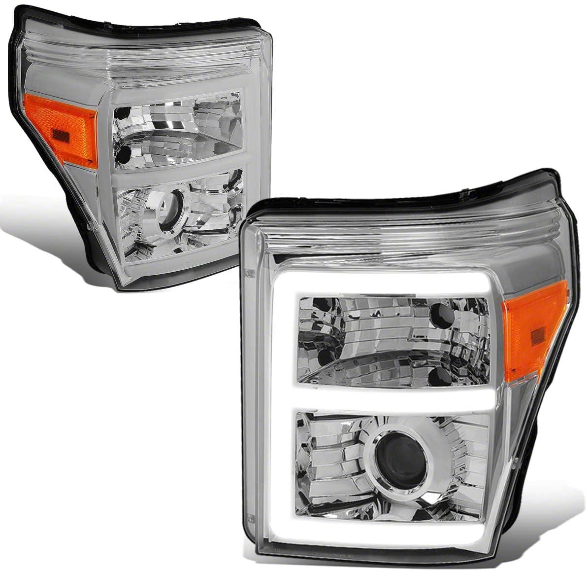 Application. The LED DRL Projector Headlights with Amber Corner Lights; Chrome Housing; Clear Lens fits 2011-2016 F-250 Super Duty models.
