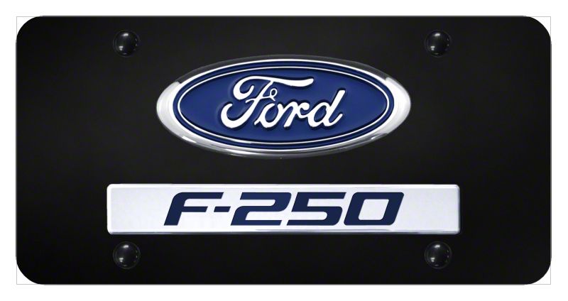Construction and Appearance. Built from durable materials and finished in high-polish chrome, this plate is made to withstand road grime, weather, and daily wear. The dual Ford-F250 emblems are cleanly printed and resistant to fading, providing a lasting look that enhances the vehicle's front or rear aesthetics.