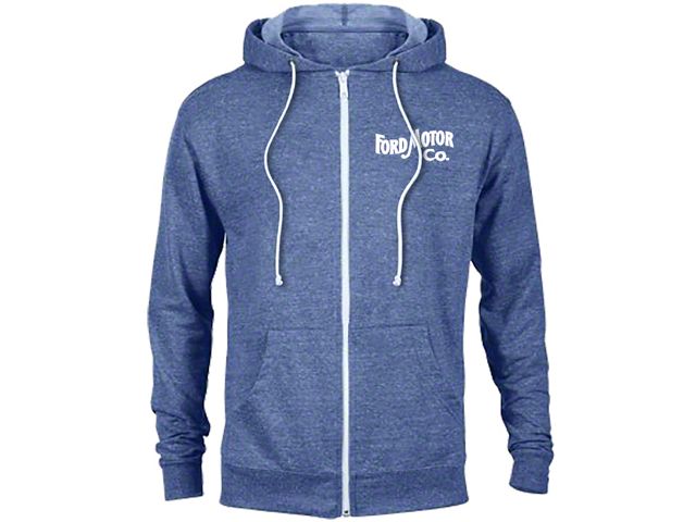 Ford Themed Graphic Hoodie. This great looking blue zip up drawstring hoodie is a must have for all Ford enthusiasts. Officially licensed, this graphic hoodie features the vintage Ford Motor Co. logo. This Hoodie makes the perfect gift for yourself or the fellow Ford lover in your life.