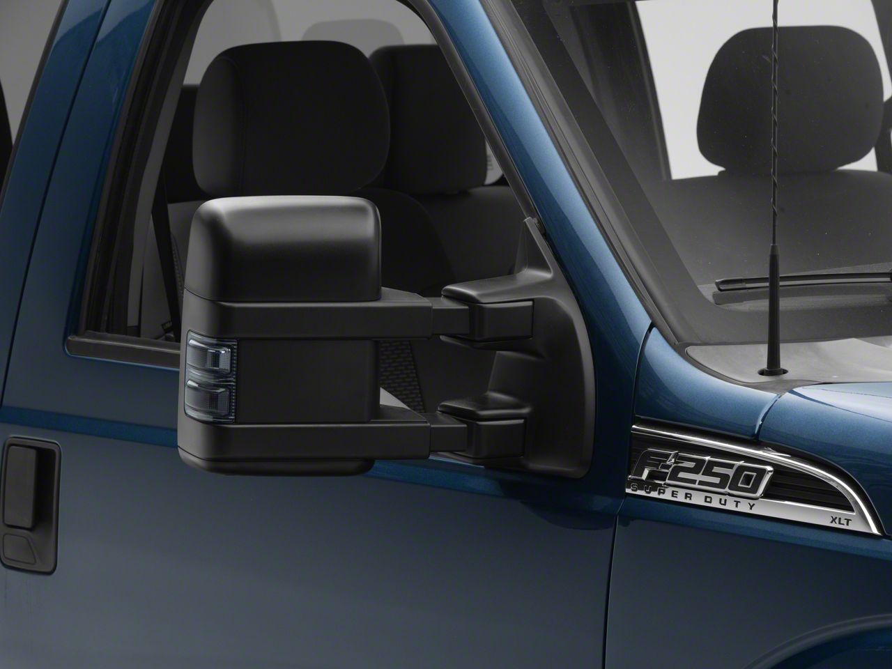 OEM Style Replacement Towing Mirror. Replace your F-250 Super Duty's cracked or broken towing mirror with a brand new OEM style replacement. This power telescoping, power folding and power-operated towing mirror is designed to replace the heated passenger side mirror found on 2011-2016 Ford F-250 Super Duty models equipped with memory function, temperature sensor, and mirror mounted turn signals.