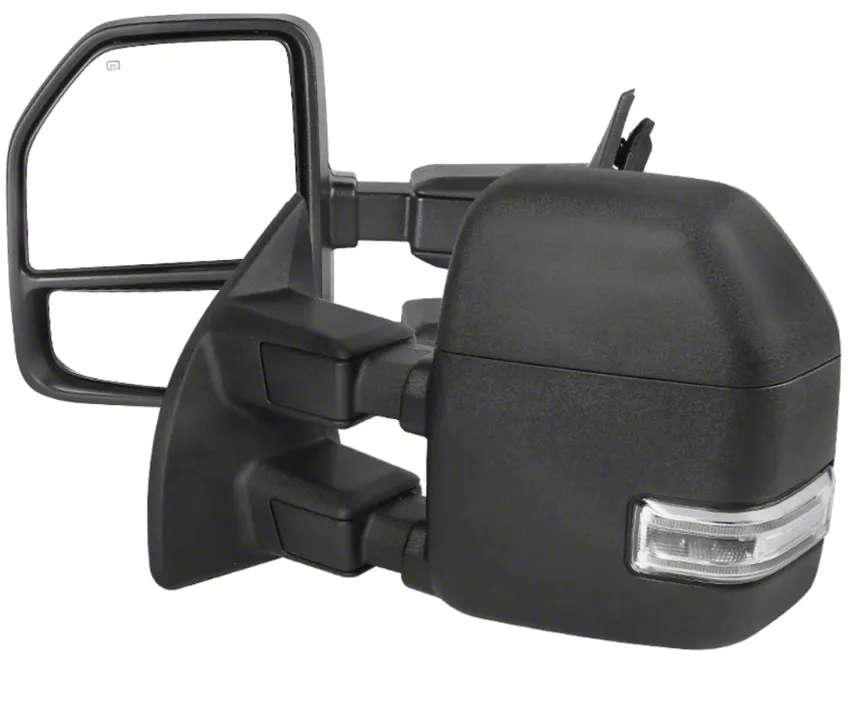 Excellent Mirror Replacements. With these Black Powered Heated Towing Mirrors with Clear LED Turn Signals, you’ll feel safer hauling a trailer with your Ford F-250 Super Duty. These impressive replacement upgrades are positioned further from your truck’s body and come with larger mirror glasses for better rearward and to-the-side views. Plus, they’re extendable and have manually adjustable convex spotter glasses, so you can manipulate their angles with ease.