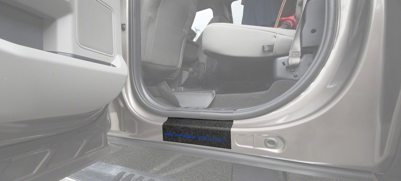 Rear Door Sill Protectors. Add a more expensive, upscale appearance to your Super Duty's interior with a set of Rear Door Sill Protectors that promote the Super Duty logo. These Tuf-Liner Series Door Sill Protectors feature a similar look to spray in bed-liner and will protect your F-250's sills from scratches, dirt, rocks, and chipping paint. These Door Sill Protectors are an affordable and simple way to personalize your SuperCrew F-250 Super Duty.