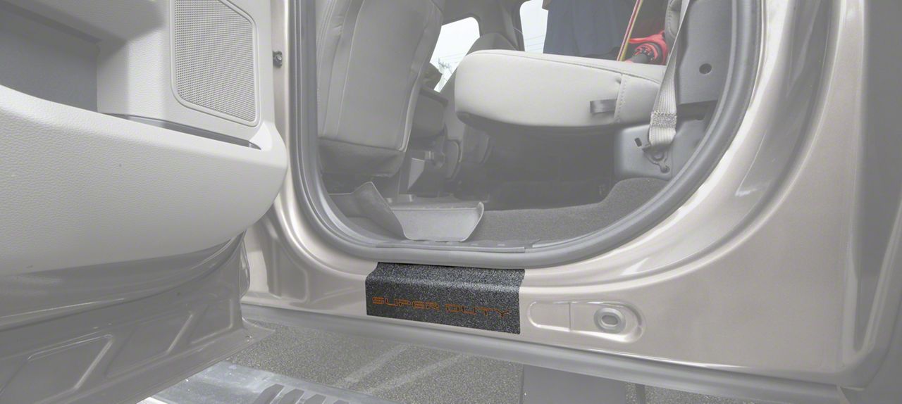 Rear Door Sill Protectors. Add a more expensive, upscale appearance to your Super Duty's interior with a set of Rear Door Sill Protectors that promote the Super Duty logo. These Tuf-Liner Series Door Sill Protectors feature a similar look to spray in bed-liner and will protect your F-250's sills from scratches, dirt, rocks, and chipping paint. These Door Sill Protectors are an affordable and simple way to personalize your SuperCrew F-250 Super Duty.