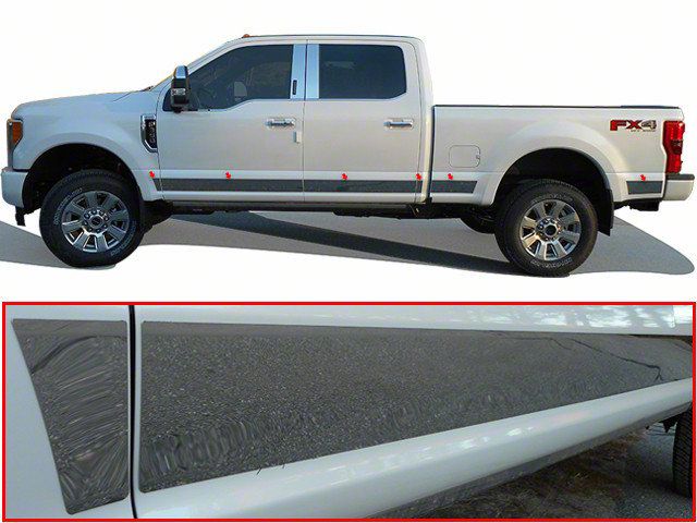 Application. The Rocker Panel Trim; Stainless Steel fits 2017-2022 F-250 Super Duty SuperCrew Models.