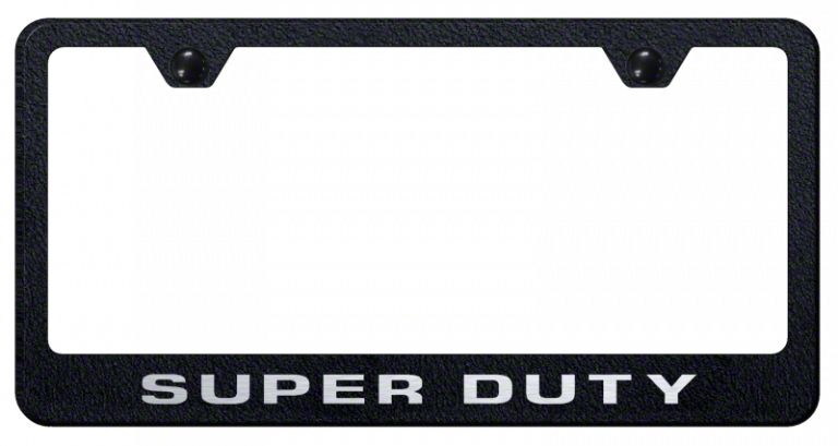 Application. This Super Duty Laser Etched Stainless Steel License Plate Frame in Rugged Black fits universally and requires minimal adjustments.