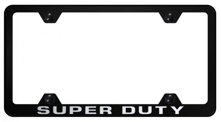 Plate Accessory. Add some flare to your ride with this Super Duty Laser Etched Steel Wide Body License Plate Frame; Black. Made to complement your mean machine, it offers support, impact protection as well as adding a sleeker look to your OEM plate.
