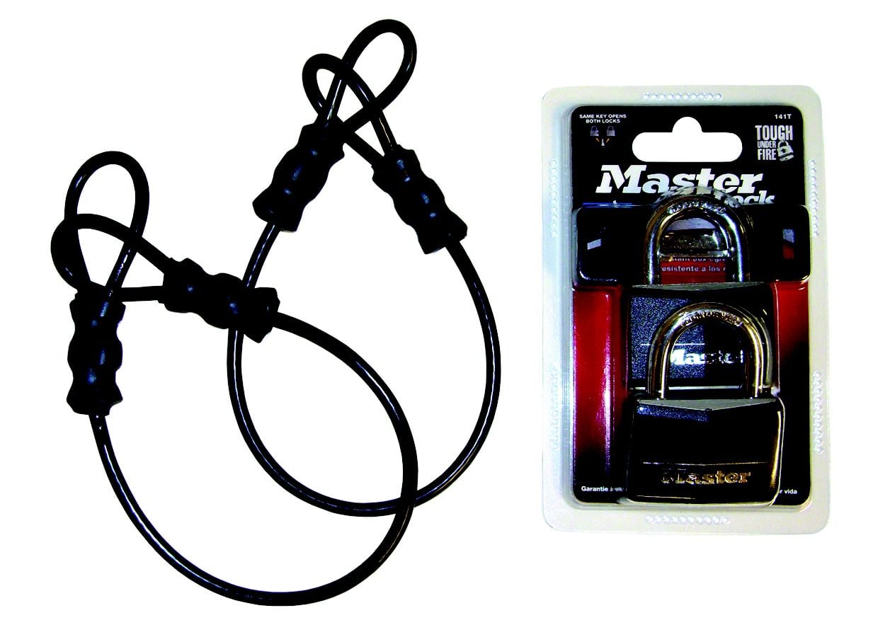 Heavy-Duty Steel Build. The Storage Lock Kit features a heavy-gauge cable construction. Each cable is looped on both ends and is secured using a padlock. The padlock itself features a hardened steel shackle and steel body for total security once locked. Finally, the cables are coated in black vinyl to prevent rust.