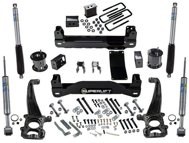 Impressive Off-Road Performance. This SuperLift 6-Inch Suspension Lift Kit with Bilstein Shocks turns your Ford F-150 into a more formidable off-roader. It increases your truck’s height by 6 inches so you can outfit it with tires up to 35 inches. This allows your truck to traverse uneven and rough terrain with remarkable ease and improved handling.