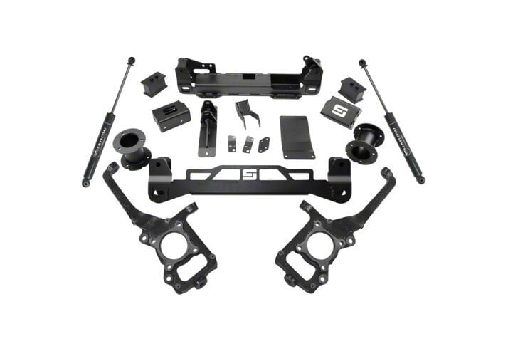 Construction and Components. This complete knuckle-style lift kit includes Shadow Shocks, ductile iron steering knuckles, plate steel crossmembers, and Grade 8 installation hardware, all in a matte and textured black finish for durability and a sleek appearance. Each component is engineered using stock CAD data for optimal compatibility and fit.