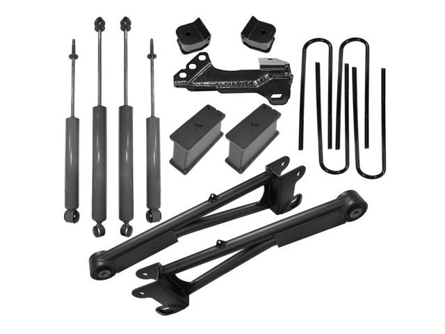 Construction and Appearance. Designed with heavy-duty radius arm drop brackets, this kit ensures proper suspension geometry and durability. The rear coil spring spacers maintain a balanced lift, enhancing overall vehicle stability. Additionally, the included Shadow Series Shocks provide excellent damping performance, improving ride comfort on rough terrain and highway driving alike.