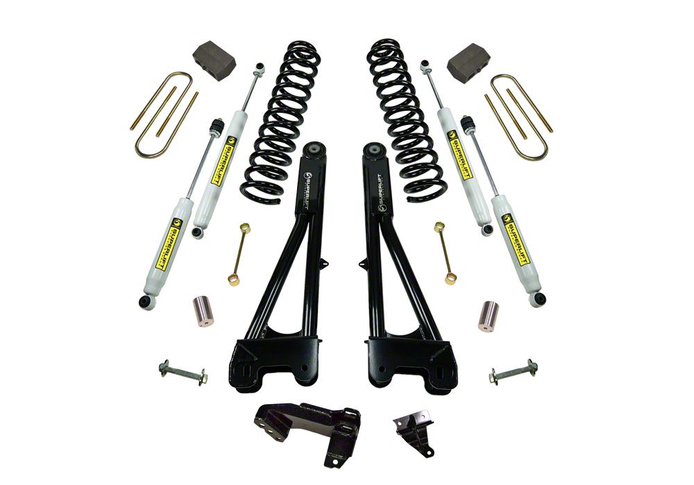 Reinforced Off-Roading. Maximize your Super Duty’s off-roading capabilities by installing the SuperLift 4-inch Radius Arm Suspension Lift Kit with Superide Shocks. This lift system accommodates up to 35x12.50-inch tires and wheels up to 20x9 with 4.50-inch backspacing. With this upgrade, you will experience superior off-road driveability and improved handling with your lifted truck set-up.