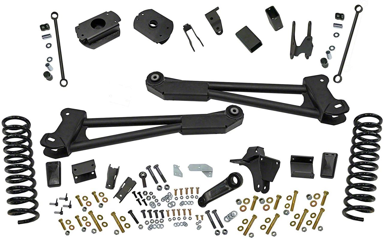 Details. The Front Lift includes: 3.50-inch coil springs, radius arm drop brackets, track bar bracket, pitman arm, sway bar correction, bump stops, brake line brackets and shock extensions. The Rear Lift includes: 2-inch coil springs, shock extensions, track bar relocation bracket, sway bar links and all required hardware.