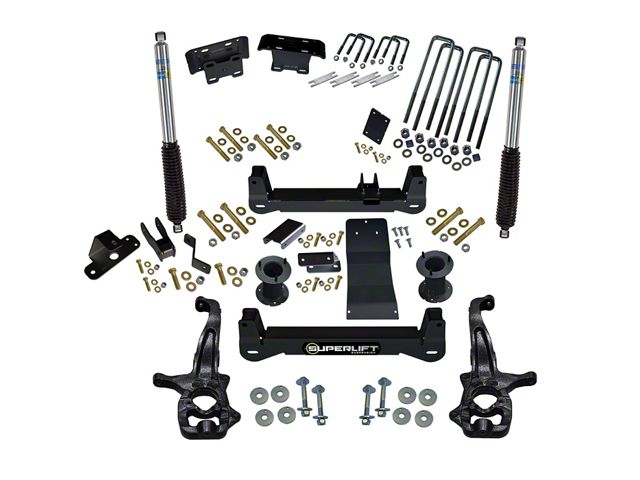 The Kit. This SuperLift 6-Inch Suspension Lift Kit comes with front knuckles, front strut spacers, quarter-inch plate steel control arm cross-members, differential drops, differential skid plate, fabricated rear blocks, U-bolts, and rear shocks.