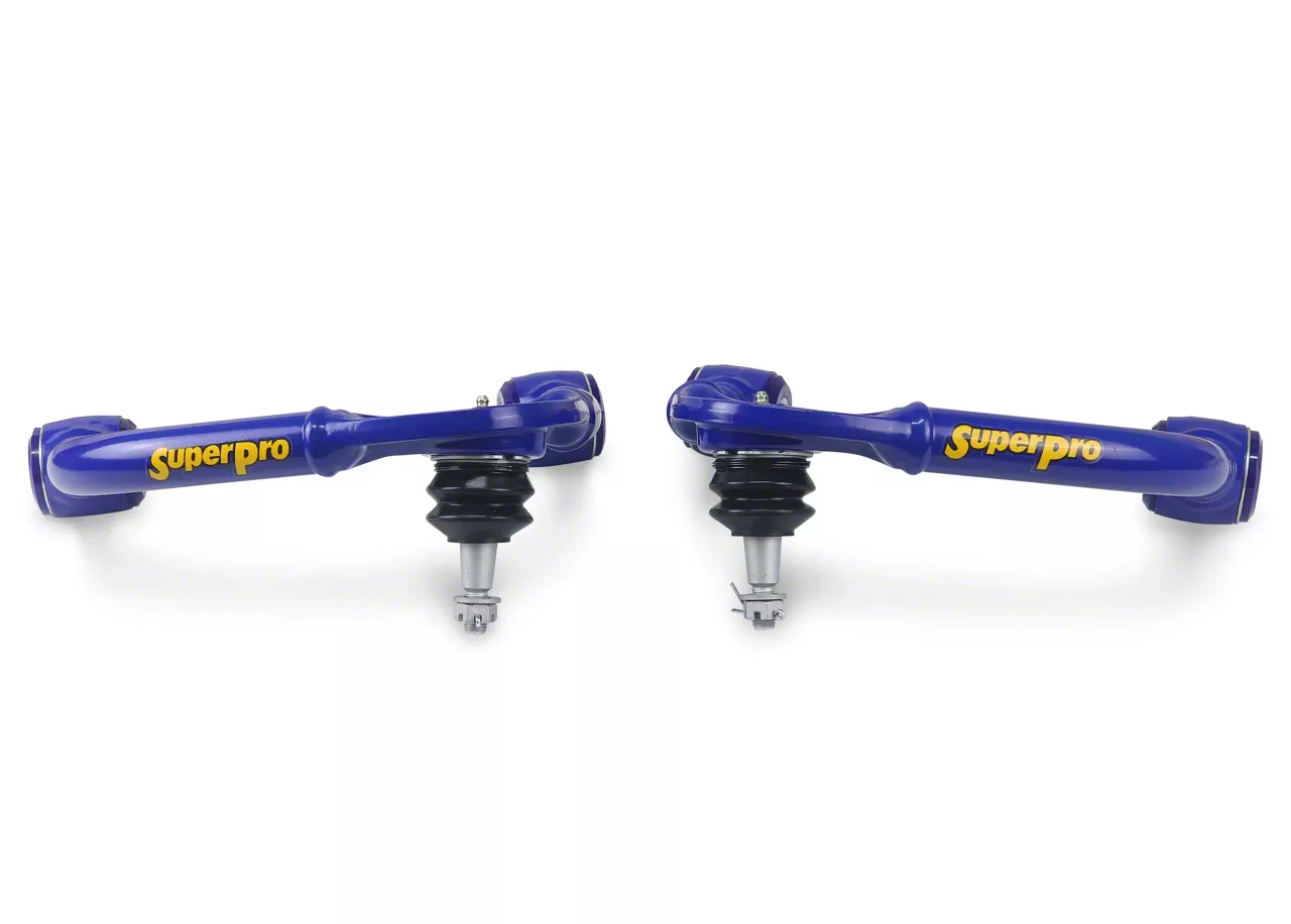 Construction and Appearance. The SuperPro Suspension Front Upper Control Arms are constructed from high-strength alloy steel for maximum durability. They feature heavy-duty, adjustable ball joints and proprietary SuperPro polyurethane bushings for long-lasting performance. Each arm is e-coated and powder-coated in a durable, smooth black finish to resist corrosion and wear.