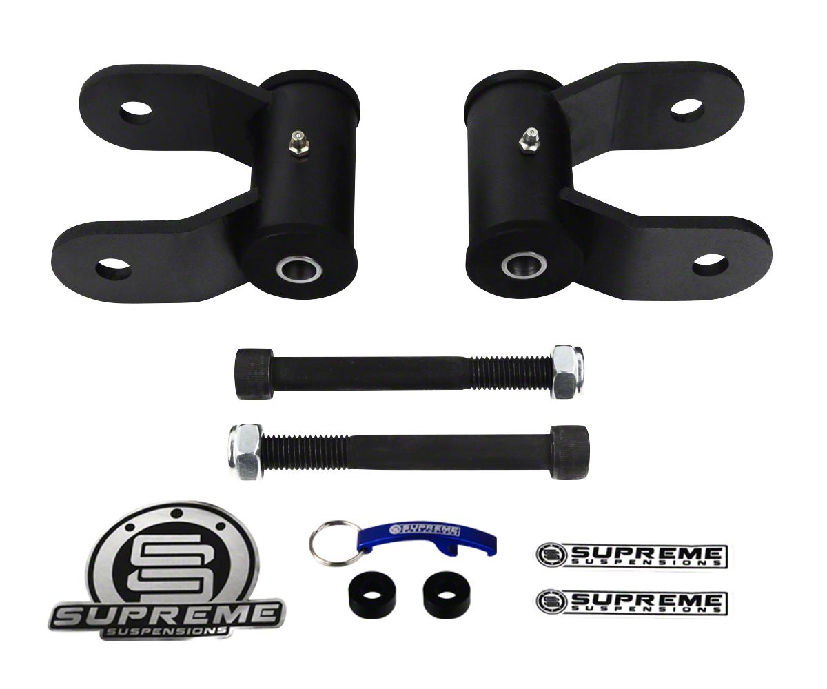 Customize Your Ride. Install these Supreme Suspensions 2 in. Rear Drop Shackles on your truck for a smooth, level driving experience. This pair of 2” shackles let you drop your vehicle while maintaining the factory ride quality. These drop shackles can handle heavy loads, and maintain their structural integrity even under demanding conditions.
