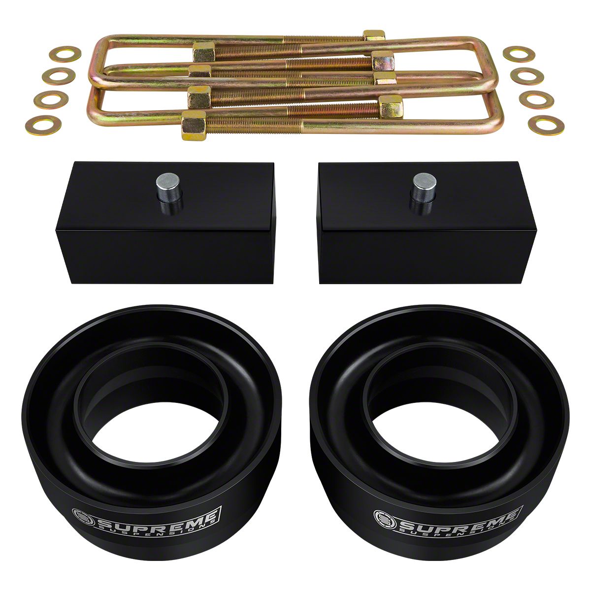Consists of Durable Components. This lift kit includes polyurethane lift spacers, zinc-plated U-bolts, and lift blocks machined from 6061-T6 aircraft aluminum and anodized-coated to prevent compression, warping, and rusting. Therefore, this lift kit is primed for supreme durability against the roughest road and weather conditions.
