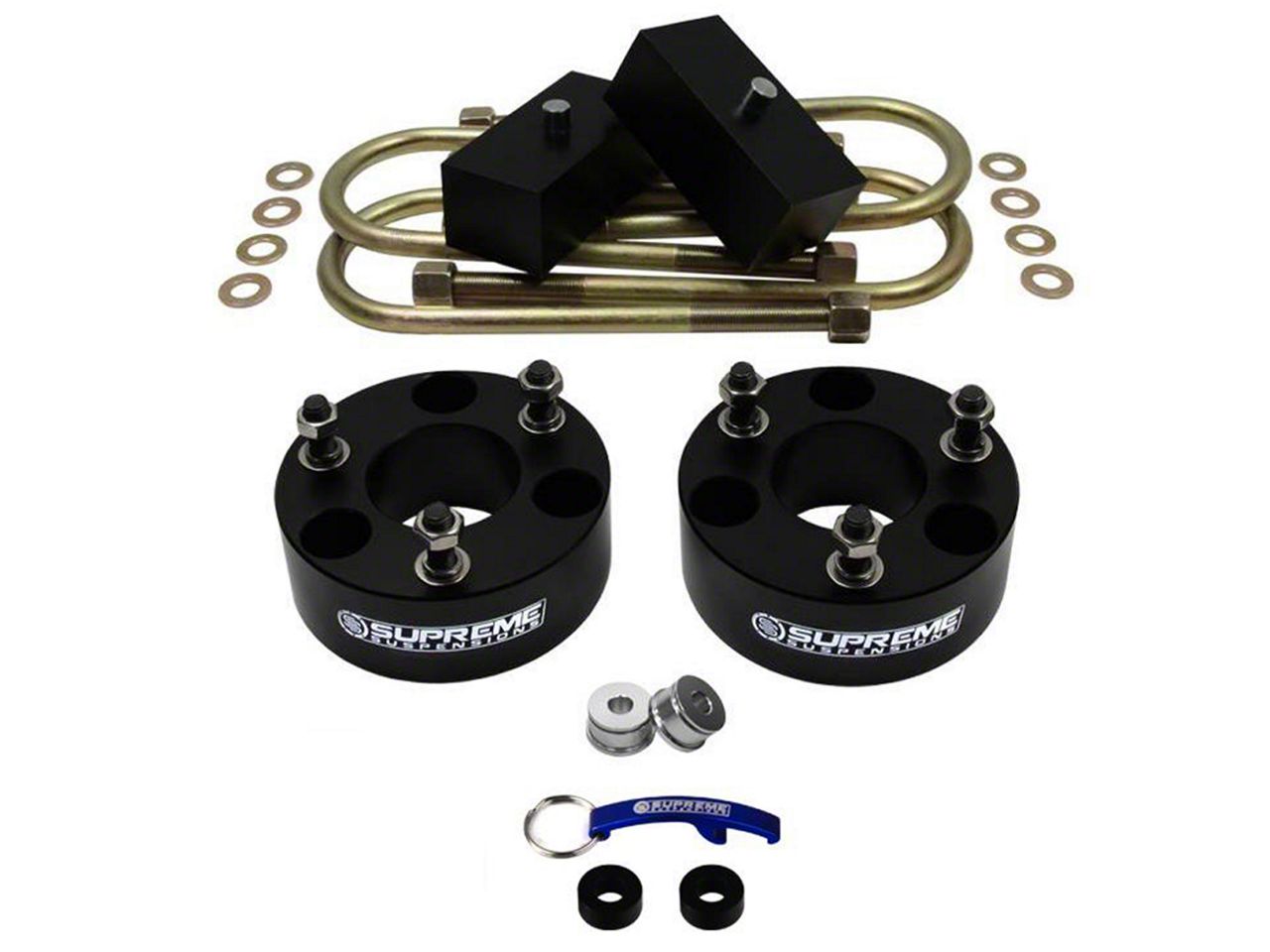Solid Construction. Supreme Suspensions designed and manufactures this lift kit from rugged materials and processes like solid T6 billet aluminum, hard anodizing and zinc plating. Components are CNC machined for precise fit, so they will integrate perfectly with your factory suspension. The zinc coating and hard anodizing protects the parts from damage from the elements, rust and corrosion, while also increasing their strength.