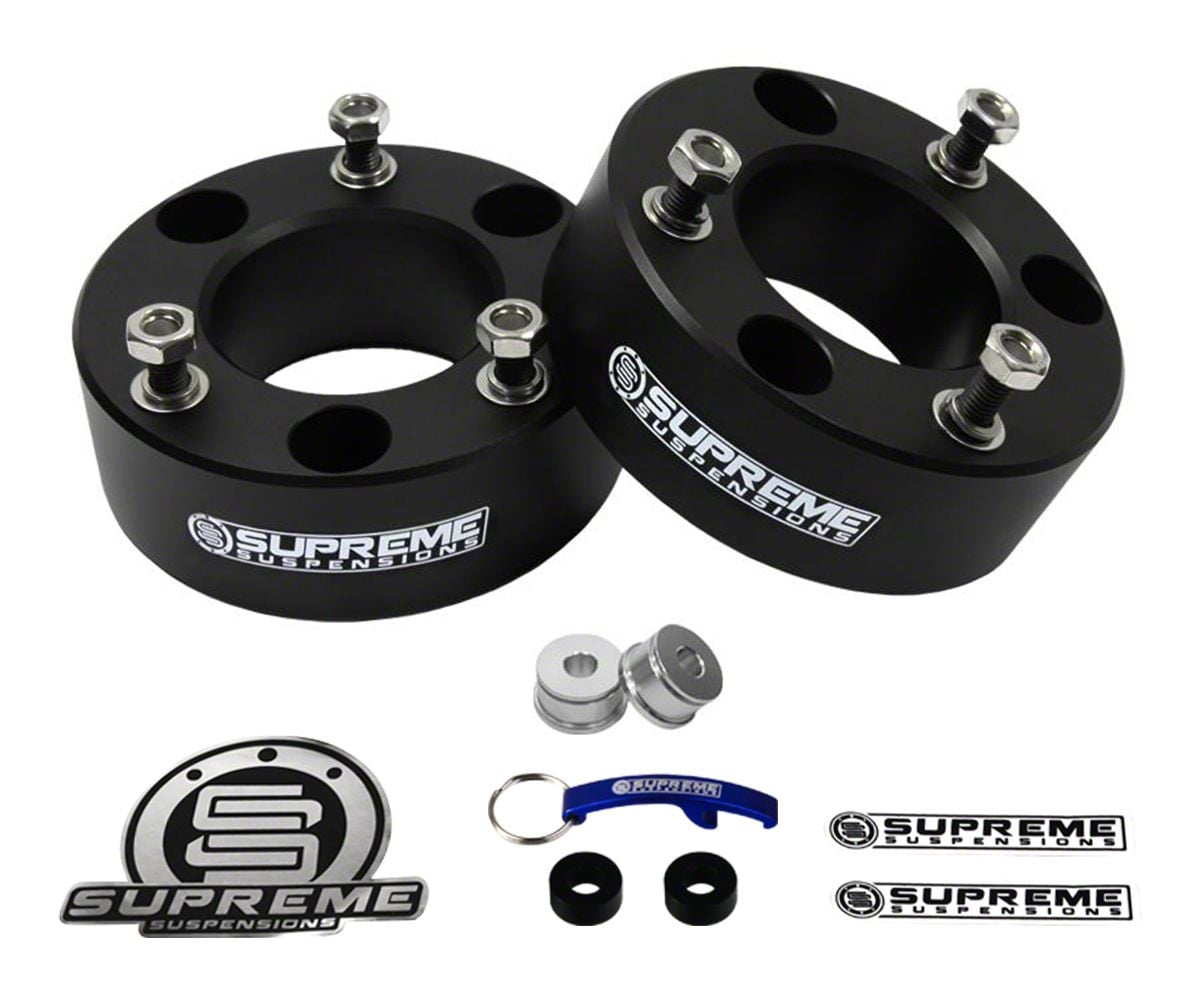 Elevate Your Ride. Use this Supreme Suspensions 3 in. Pro Billet Front Strut Spacer Leveling Kit to lift your truck 3” for a tough, aggressive appearance. Not only does this kit enhance the look of your truck, it increases ground clearance and supports large, wide tires for improved off-road performance. Even cornering and handling is improved, and your ride quality is never compromised.