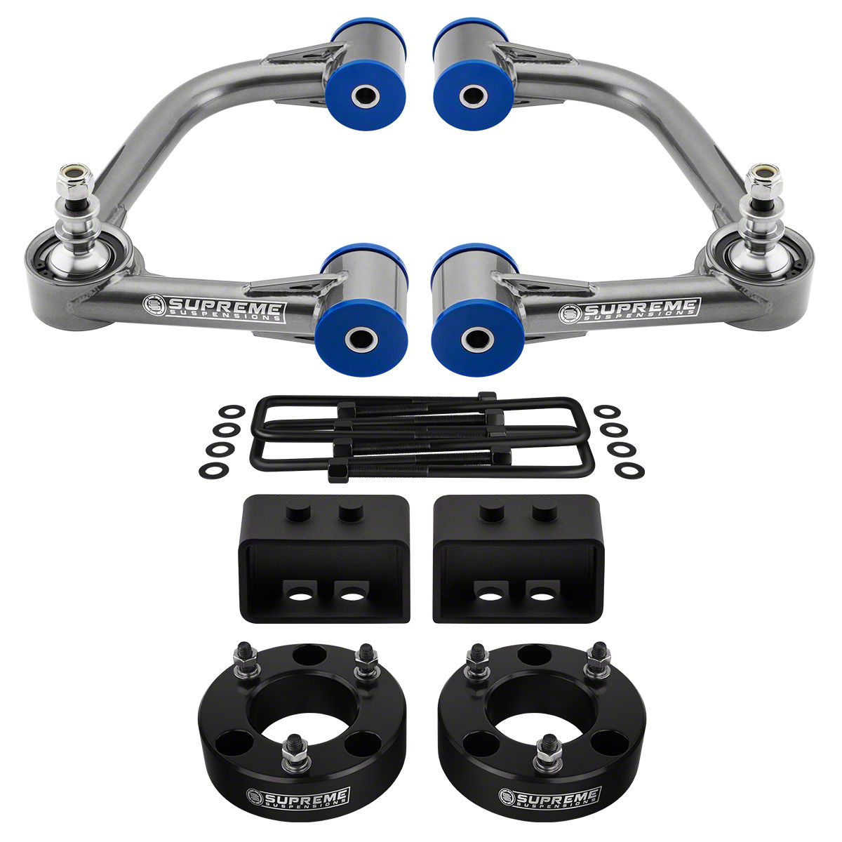 Front Spacers and Rear Lift Blocks. The spacers and rear lift blocks in this kit are crafted from highly durable material and come covered with a special anodized coating. The provided U-bolts and hardware are also constructed from heavy-duty material. As a result, this kit has the strength and durability to keep up with your truck’s high-performance applications.