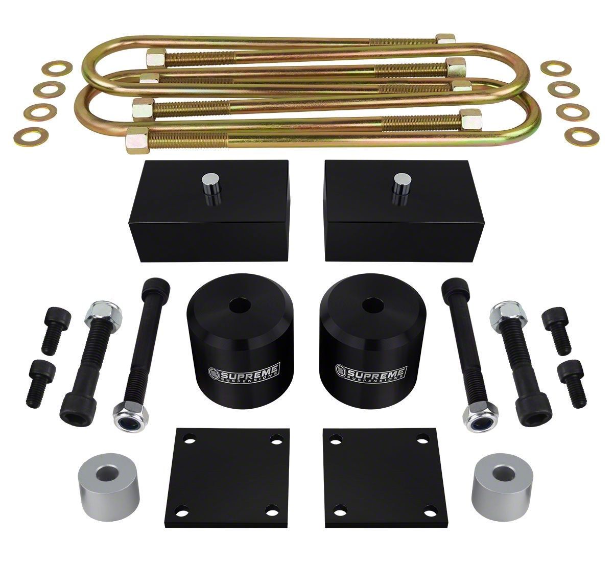 Heavy-Duty Components. Built to provide your Super Duty with superior stance, Supreme Suspensions includes high-strength strut spacers, lift blocks, and U-bolts crafted using heavy-duty materials. The T6 aircraft billet aluminum spacers and blocks were further fortified with a hard-anodized finish to provide an added layer of protection for lasting functionality.