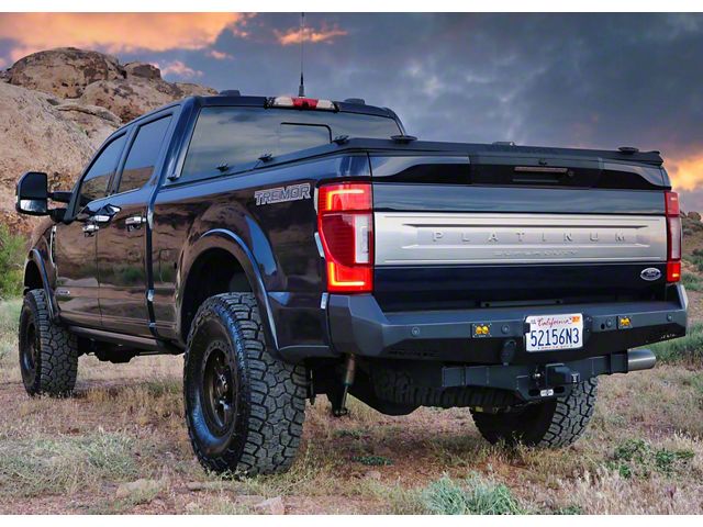 Robust Protection. Elevate the ruggedness and functionality of your F-250 Super Duty with the SVC Offroad Mojave Rear Bumper; Black. Its sturdy construction guards against impacts and off-road hazards, ensuring your truck remains safe and undamaged in various driving conditions. Designed with off-roading in mind, it provides enhanced clearance and durability, making it ideal for navigating tough terrain and challenging trails.