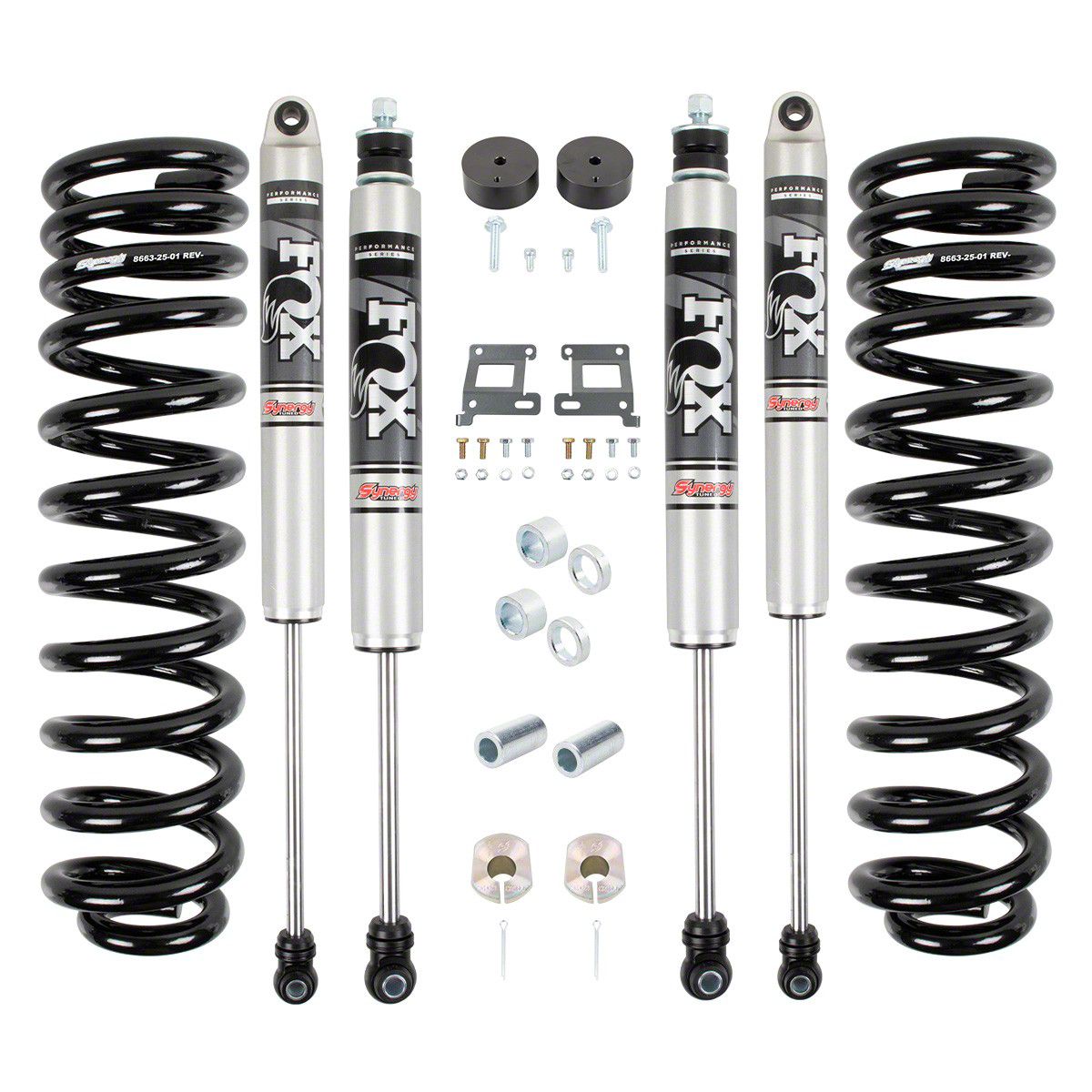 High‑Performance Leveling Kit. The Synergy Manufacturing 2.50‑Inch Front Leveling Kit with FOX Shocks elevates the front of your Ford F‑250 for a level stance, improved ride quality, and enhanced suspension travel. It features Synergy‑tuned FOX shocks and hot-wound progressive coil springs engineered to improve comfort and control, while enabling larger tire installation.