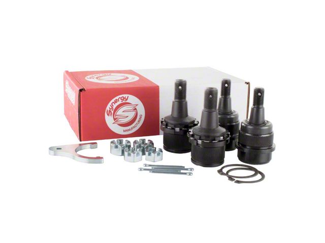 Installation. The Synergy Manufacturing HD Adjustable Ball Joint Kit; Knurled replaces existing ball joints. Requires disassembly of the wheel hub and steering knuckle. Pressing out the old ball joints and pressing in the new ones is required, which might necessitate specialized tools.