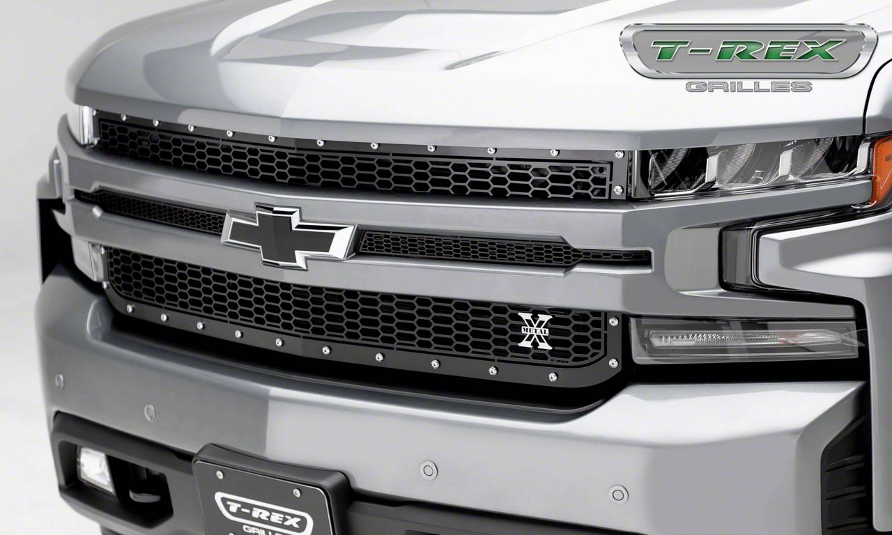 Sturdy Upper Replacement Grille. This T-REX Laser X-Metal Series Upper Replacement Grille is not only built for good looks, but for durability as well. Featuring heavy-duty mild steel construction, this upper replacement grille provides an exceptional level of front-end protection. Completing the assembly is a black powder-coated finish that enhances the overall look of your Silverado.
