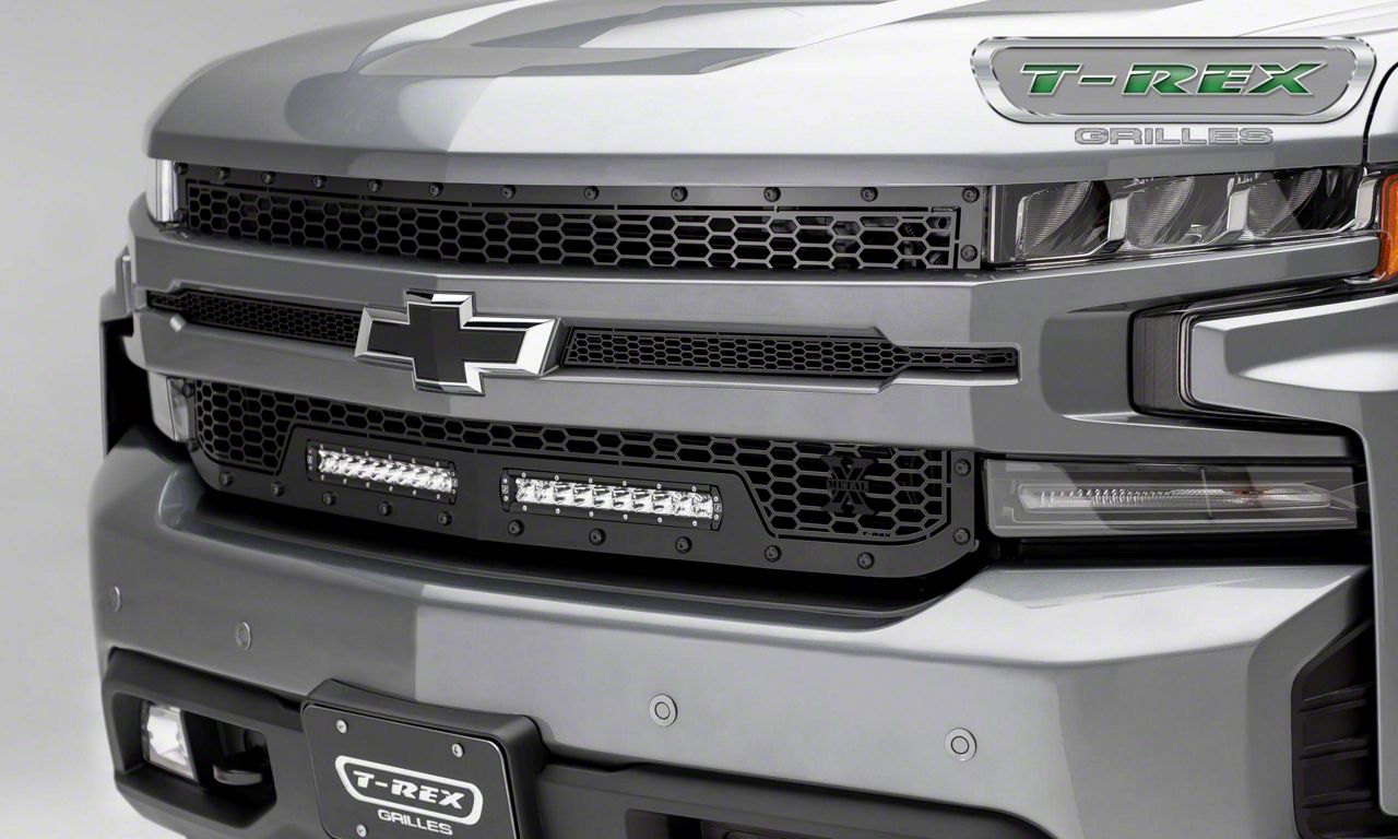 Cool Design. Nothing says cool more than this Black T-REX Stealth Laser Torch Series Upper Replacement Grille with Two 10-inch LED Light Bars. This grille adds an attractive look to your Silverado’s front end thanks to the cool, repeating honeycomb pattern T-REX uses. In addition, this T-REX Stealth Laser Torch Series Upper Replacement Grille comes with built-on ZROADZ LED lights for enhanced illumination.