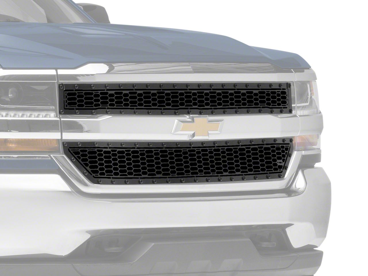 Superior Upgrade. T-REX's Black Stealth Laser X-Metal Series Upper Grille Overlay is the ideal upgrade for your 2016-2018 Chevrolet Silverado 1500. A massive improvement over your stock piece, this grille overlay dramatically enhances your rig's appearance with a unique repeating honeycomb pattern that bolsters its already violent and industrial look to ensure your truck turns heads regardless of where you venture. The unique design is paired with X-metal black studs, a 12-gauge frame, and woven wire mesh to complete the hardcore style. Not only does the overlay look tough, but it is also heavy-duty enough to withstand the damage of any obstacles in your path, on or off-road.