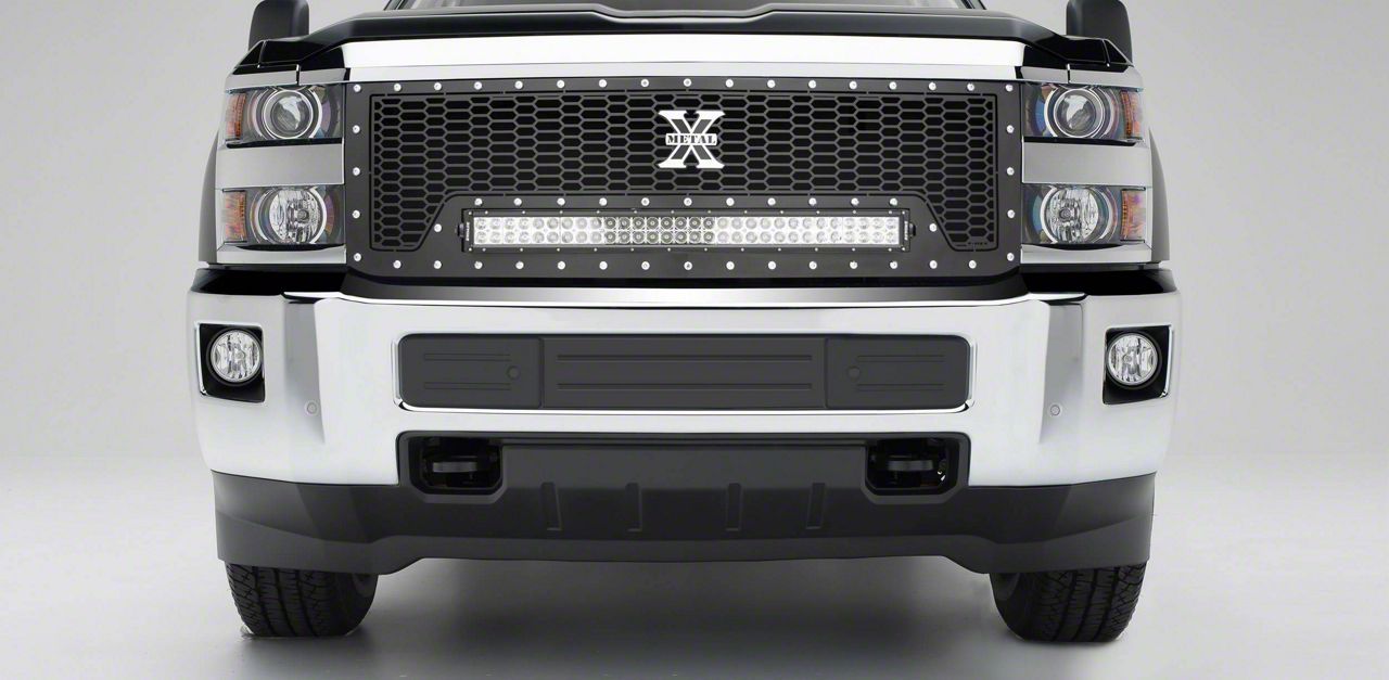 Eye-Catching Feature. T-REX offers these upper replacement LED light grilles for the hardcore devotee who wants to be seen. The Silverado 2500 Laser Torch Series, Upper Replacement Grille with 30-Inch LED Light Bar is preassembled and fastened by durable mesh with the fabled X-Metal studs. X-Metal branding is imprinted on every stud, and the proprietary X-Metal Grille emblem appears on every grille. The grilles are available in black powder-coated finishes and with black or chrome studs. All Torch Grilles come with a wire harness. Also available are corresponding bumper grilles, light brackets, and lights. There is a separate charge for the main grille and the bumper grilles.
