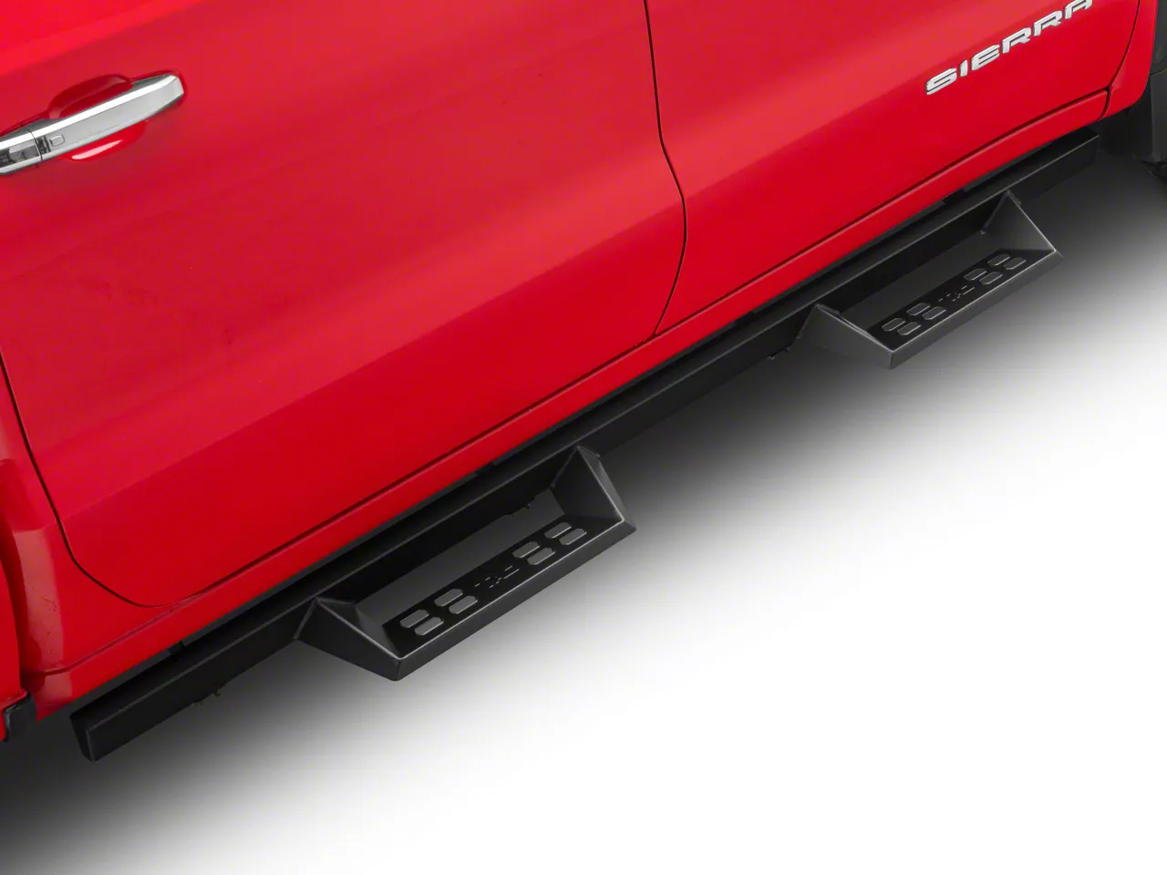 Application. The 4-Inch Drop Sniper Running Boards; Textured Black fit 2019-2026 Sierra 1500 Crew Cab models.