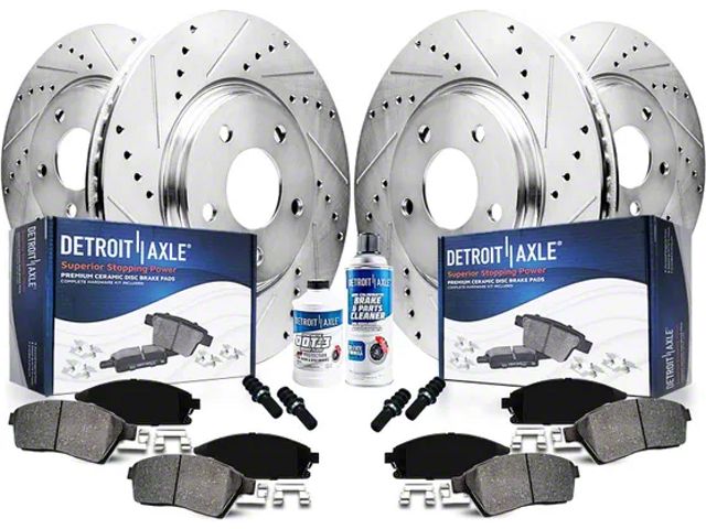 Premium-Quality Kit Components. The kit includes high-quality drilled and slotted 8-lug brake rotors, offering superior stopping power and enhanced cooling, resulting in reduced brake fade and increased durability. Alongside the rotors, you'll find ceramic brake pads that deliver excellent stopping performance, low dust, and reduced noise. To ensure optimal functionality, the kit also includes brake fluid and cleaner, allowing for comprehensive brake system maintenance.