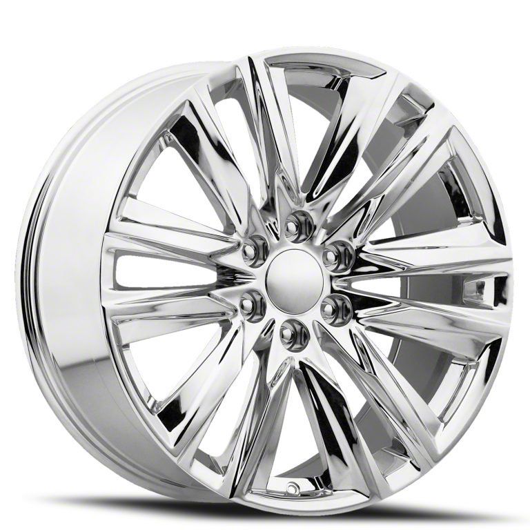 Application. This Escalade Sport Replica Chrome 6-Lug Wheel; 22x9; 28mm Offset, with a backspace of 6.102 Inch, 155mm and bolt pattern of 6 x 139.7mm (6 x 5.5-Inch), ensures proper alignment and stability. It's designed to fit the 2021-2026 Tahoe models, enhancing both the look and the overall driving experience. Sold individually.