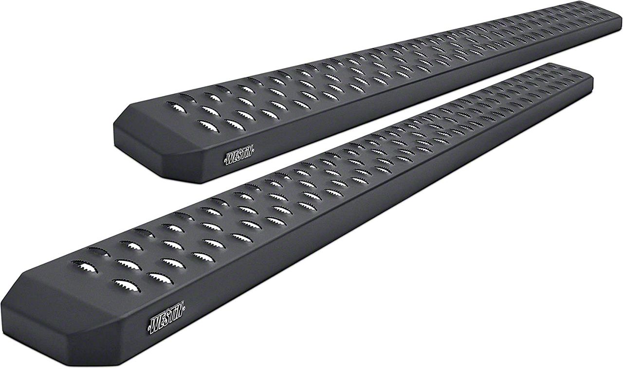 Construction and Appearance. Made from top-notch solid steel, the Westin Grate Steps are coated in a black, corrosion-resistant finish. The 1/4-inch high punched tread and serrated edges ensure a firm foothold in extreme conditions, while the solid steel composition guarantees long-lasting durability and performance.