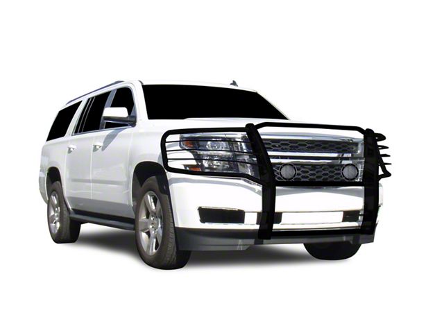 Durable Grille Guard. This Grille Guard is designed to provide robust protection for the front end of your Tahoe. It includes (2) 5.30-inch matte black finish round flood LED lights, installation instructions, and all necessary hardware. The matte black finish adds a sleek, rugged look to your vehicle while enhancing its ability to withstand impacts and minor damage.