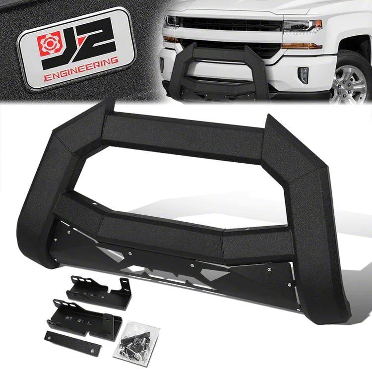 Rugged and Tough. Give your Silverado a rugged offroad look while protecting its front end at the same time with J2 Square Bull Bar in Black. This bull bar is a sturdy protection for your grill, ensuring no random road debris will get into the grill and cause any damage. It also comes with a bat-face-designed skid plate that protects your undercarriage and is removable if you prefer.