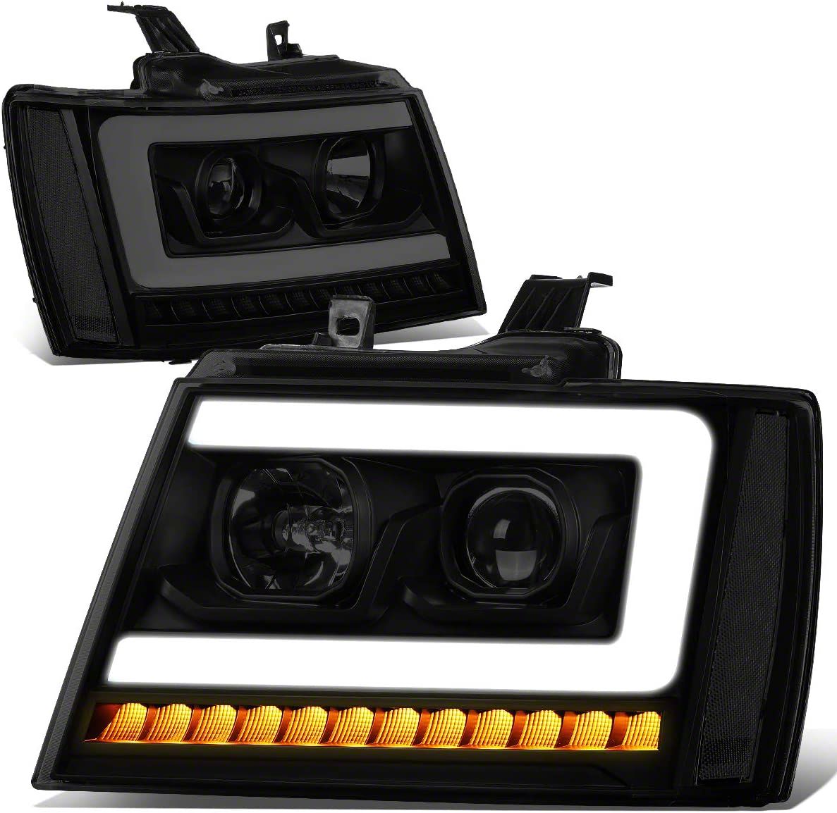 Application. This LED DRL Projector Headlights with Clear Corners and Black Housing and Smoked Lens fits all 2007-2014 Chevrolet Tahoe models.