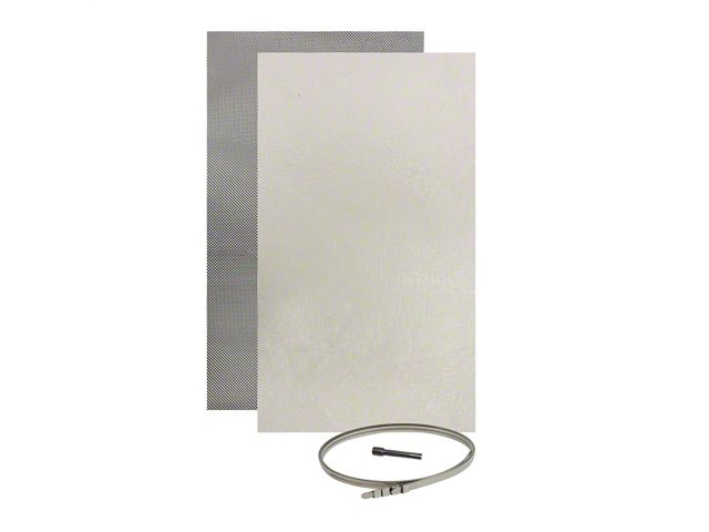 Construction and Appearance. Made from 10-mil dimpled aluminum and featuring a 1/8-inch needle glass insulator, this muffler shield kit is both durable and effective. The material can be easily trimmed to fit any size of muffler, providing a customized fit for various applications.