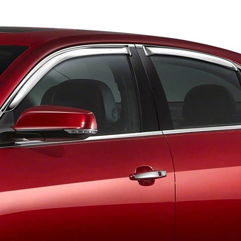 Construction and Appearance. Manufactured from durable acrylic, these outside mount rain guards are built to withstand daily driving and harsh environmental exposure. The smoke finish provides a sleek, tinted look, while the chrome trim accent adds a refined touch that complements factory styling. Precision molding ensures proper alignment and long-term durability.
