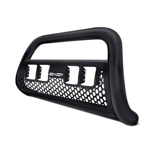 Stylish and Off-Road Functional. Got a worn-out front bumper or simply want to enhance the front fascia of your vehicle? Let the Go Rhino RC2 LR Bull Bar with Four LED Cube Light Mounting Brackets - Textured Black do that for you. Brawny and bold with steel mesh covers, this accessory will not just boost the aesthetic value of your truck. It will also enable you to install 4 3-inch LED Cube lights for enhanced illumination off-road, as well as a winch at a max rating of 12,500 pounds behind the removable covers for getting you or others out of stranded situations.