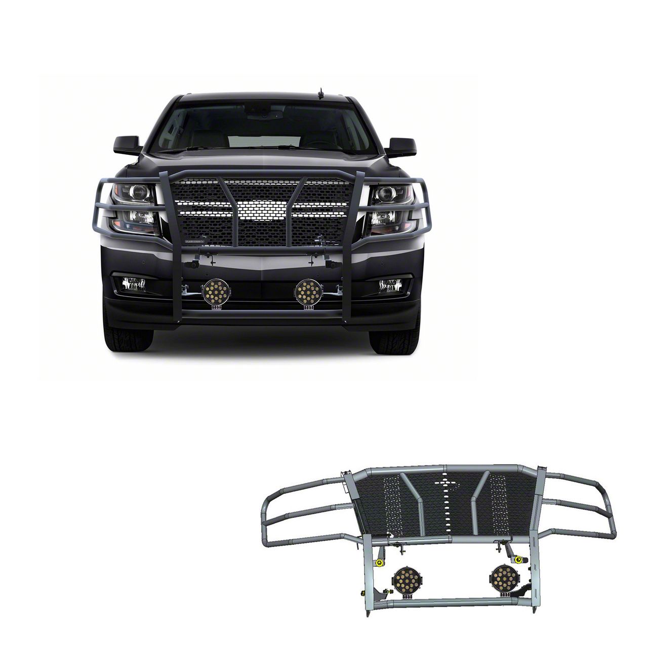 Robust Frontal Protection. The Grille Guard for 2015 - 2020 Tahoe models is a heavy-duty, rugged accessory designed to offer superior protection against bumps, hits, and minor damages. Its matte black finish not only provides a sleek and stylish look but also enhances the vehicle's front-end durability. This grille guard includes two 7-inch round LED lights in a matching matte black finish, offering improved visibility and a modern aesthetic upgrade.